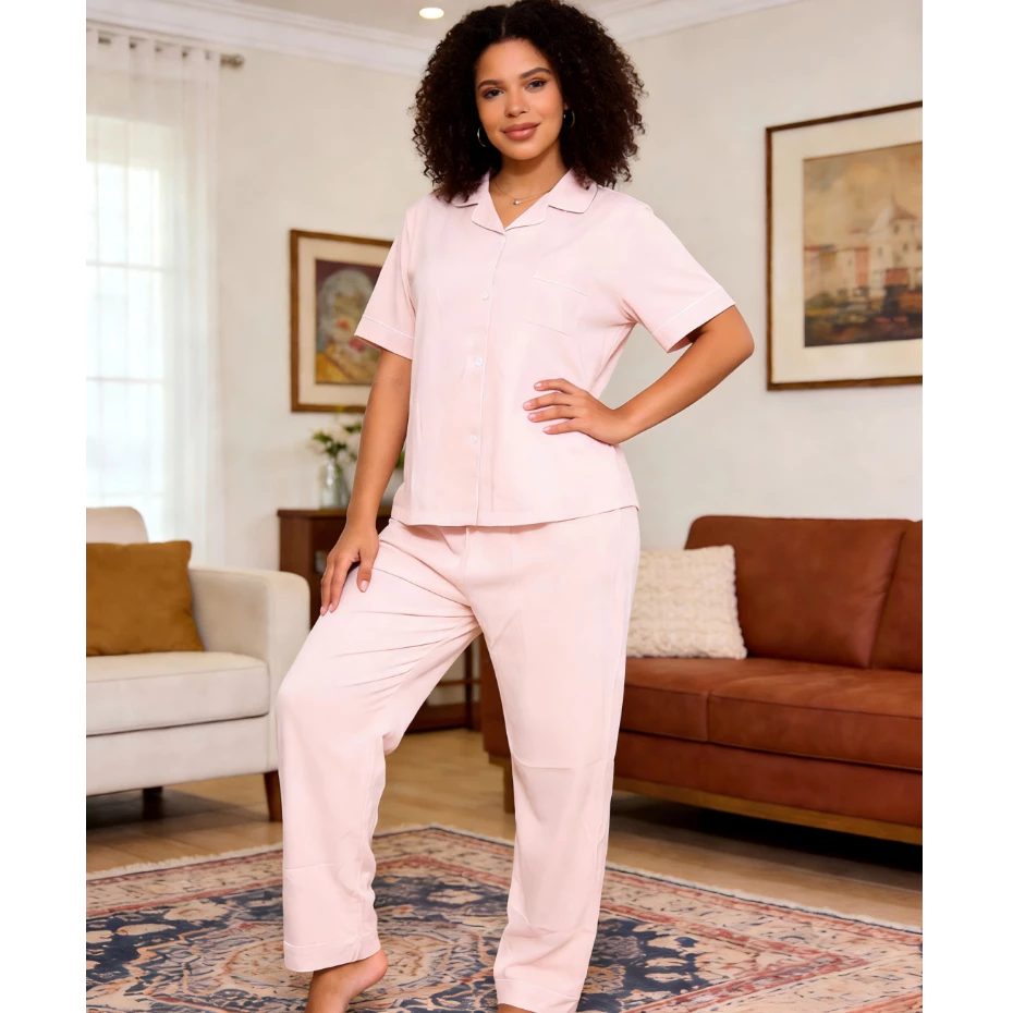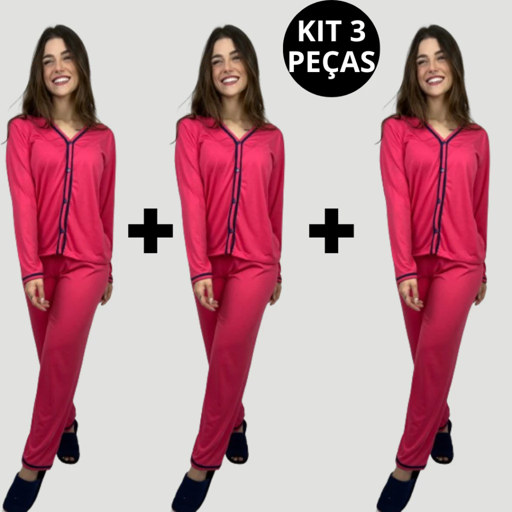 O conjunto que funciona melhor nessa categoria é o modelo de calça comprida com blusinha de botões na frente. A blusa com botões permite regular a ventilação sem precisar tirar a peça, e a calça fluida não aperta nas pernas mesmo quando você vira muito na cama. A modelagem reta, sem franzido excessivo, evita que o tecido acumule em lugares incômodos.