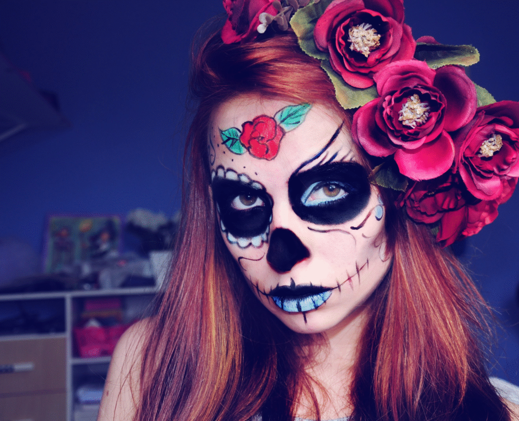 Inspirada na icônica La Catrina, a caveira mexicana é uma das maquiagens mais simbólicas e artísticas do Halloween. Seu charme está nos detalhes: a base branca cobre o rosto, servindo de tela para desenhos coloridos e expressivos. Os olhos ganham destaque com círculos pretos ou azuis escuros, cercados por pétalas ou arabescos vibrantes. Pequenos pontos, flores e corações podem ser adicionados para personalizar o visual. O nariz é pintado com formato triangular e a boca recebe traços que simulam costuras, completando o efeito sombrio e elegante. Essa maquiagem é perfeita para quem deseja um visual marcante e cheio de significado, mesclando beleza, cultura e um toque poético de mistério.