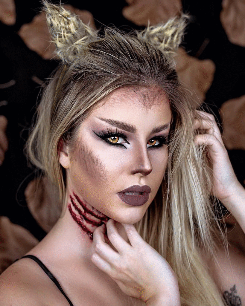 A maquiagem de lobisomem urbano é perfeita para quem busca um visual intenso e realista sem precisar de grandes produções. O segredo está na criação de arranhões falsos e texturas de pele selvagem. Com lápis vermelho e sombra marrom, desenhe cortes e esfumados que simulem feridas profundas. Adicione sangue falso com pincel fino para dar mais veracidade. O contorno do rosto pode ser acentuado com tons acinzentados ou terrosos, criando a aparência de uma transformação em andamento. Combine o visual com roupas rasgadas, jaquetas de couro ou peças envelhecidas para um resultado digno de um filme de terror moderno. Essa opção é ideal para quem prefere uma maquiagem prática, rápida e de efeito cinematográfico.