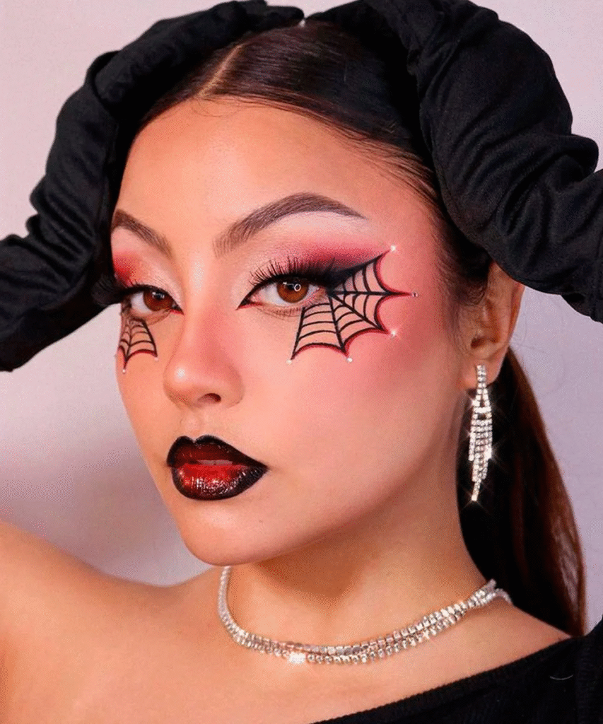Nem sempre é preciso investir horas para criar uma maquiagem impressionante. A aranha minimalista é a escolha perfeita para quem quer algo rápido, artístico e cheio de estilo. Usando apenas um delineador preto e um pouco de sombra escura, é possível desenhar teias delicadas ao redor dos olhos ou na testa. Pequenas aranhas podem ser criadas nas bochechas ou no pescoço para adicionar um toque macabro e elegante. Para realçar o efeito, aposte em cílios longos, batom escuro e iluminador prateado. Essa maquiagem combina muito bem com roupas pretas ou metálicas e é ideal para quem deseja causar impacto com o mínimo de esforço — uma opção perfeita para festas de última hora ou para quem quer arrasar nas fotos das redes sociais.