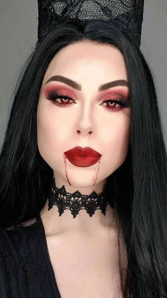 A maquiagem de vampira é um clássico que nunca sai de cena — e em 2025, ela aparece mais glamourosa do que nunca. Comece com uma pele impecável e bem iluminada, destacando os contornos faciais com precisão. Os olhos ganham protagonismo com sombras metálicas escuras, delineado gatinho e cílios postiços volumosos. O batom vermelho profundo é indispensável, podendo ser complementado com sangue falso escorrendo dos cantos da boca. Para um toque extra de realismo, adicione lentes de contato vermelhas e presas falsas. Essa maquiagem é ideal para quem quer unir beleza e terror, transmitindo poder, mistério e sofisticação em um único visual.