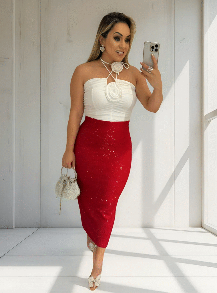 O brilho é presença garantida nas festas de fim de ano. Uma saia midi com paetês, lurex ou acabamento acetinado pode ser facilmente equilibrada com uma blusa mais básica. Essa combinação cria um visual glamouroso, sofisticado e atual, sem exageros, perfeito para a ceia natalina.
