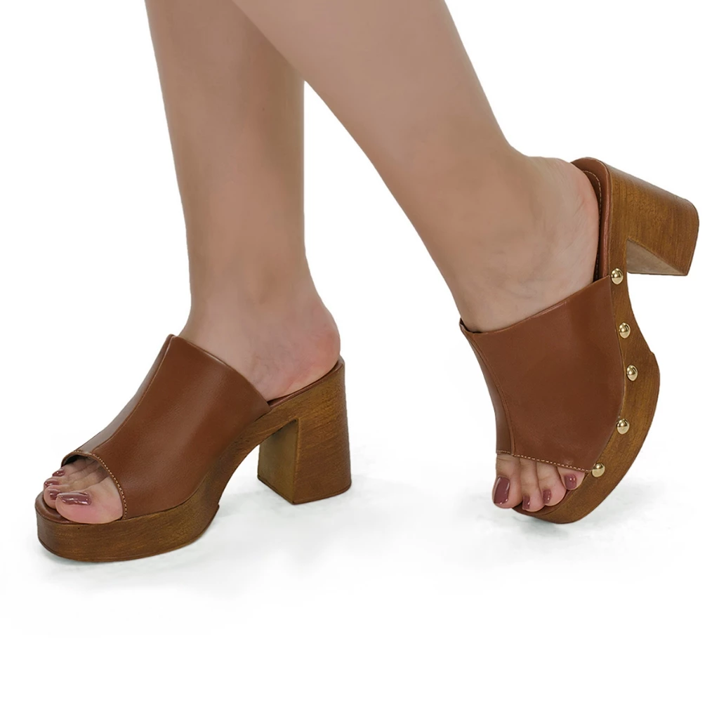 Esse é o modelo que divide opiniões, e é exatamente por isso que ele está nessa lista. O tamanco de madeira — ou com solado que imita madeira em borracha densa — voltou ao street style global no verão 2024/2025 com uma proposta diferente da sua encarnação original dos anos 70: menos rústico, mais construído. As versões atuais têm tachinhas metálicas, tiras de couro ajustáveis e acabamento que oscila entre o boho refinado e o industrial leve.