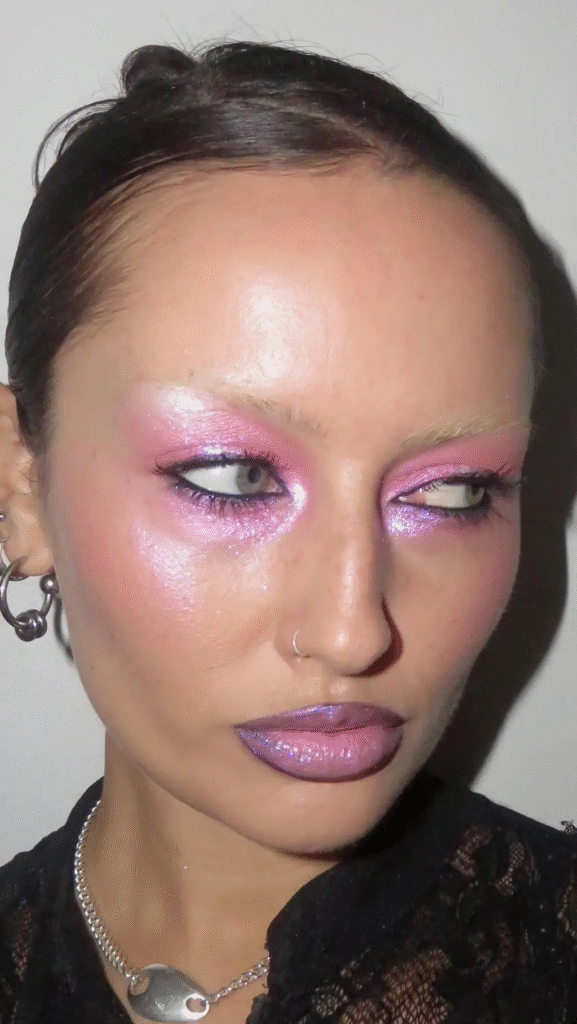 Nesta inspiração, o blush rosado com acabamento cintilante surge como um complemento equilibrado para maquiagens com foco nos olhos. O glow aparece de maneira suave e translúcida, iluminando a pele sem competir com delineados gráficos ou traços mais ousados. É uma escolha estratégica para quem deseja destacar o olhar e, ao mesmo tempo, manter a pele elegante e bem iluminada.