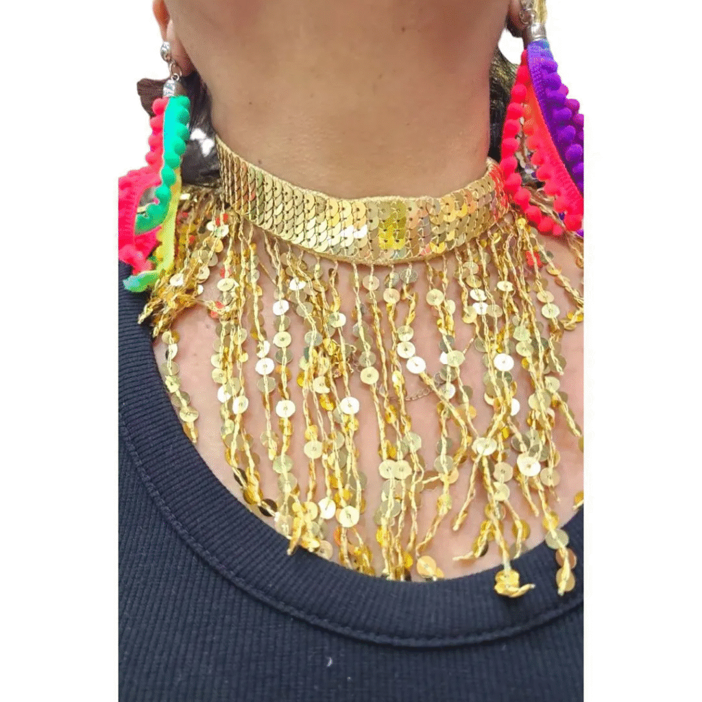 Combine no máximo três tipos de acessórios chamativos. Se vai de tiara chamativa com LED, aposte em brincos discretos. Se escolheu cinco colares oversized, pegue leve no restante. O segredo está no equilíbrio – você quer destaque, não virar árvore de Natal.