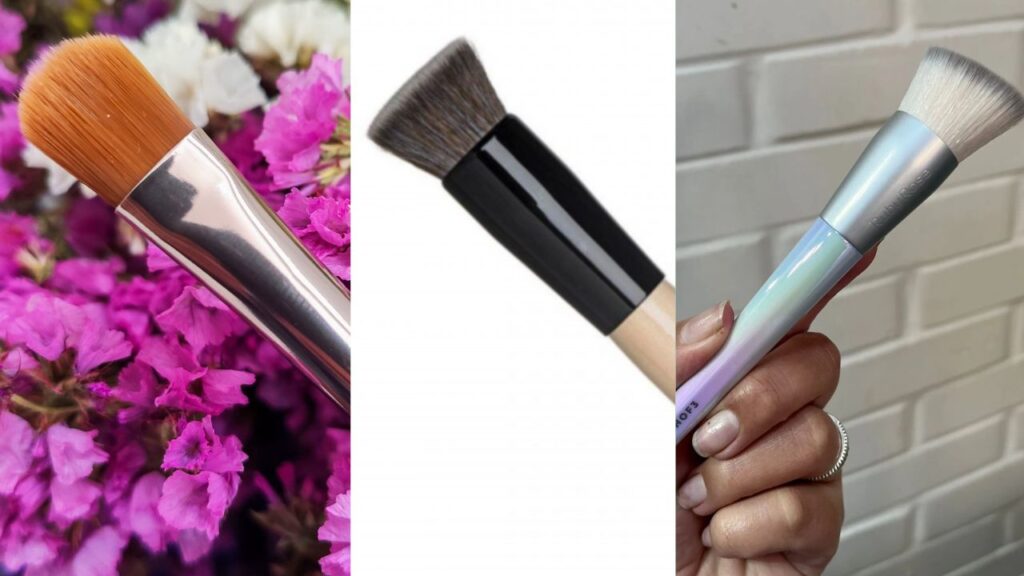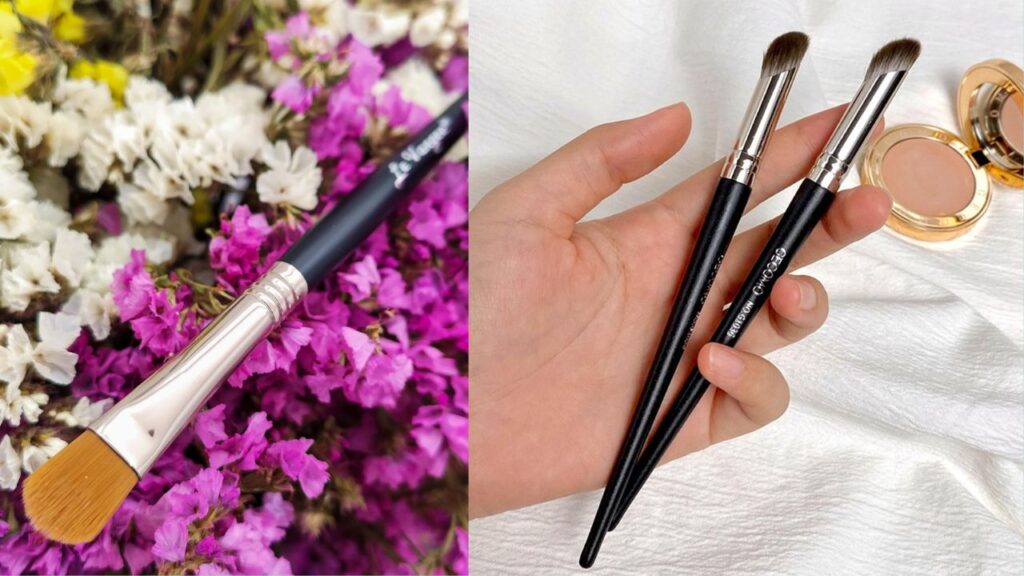 • Língua de gato: possui cerdas achatadas e firmes, ideal para bases líquidas ou cremosas. Proporciona cobertura uniforme e atinge áreas de difícil acesso, como cantos do nariz.